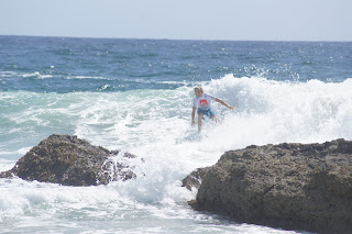 Am nöchste Tag esch den s Tornier wiitergange. Mer send grad acho wo de Kelly Slater sini letzti wälle verwötscht hed. De Kelly Slater esch so z säge de Roger Federer vom Surfe. Är esch scho 40i ond zeigt de jonge surfer emmerno wo s lang god. Mettlerwiile esch är 11 fachi Wältmeister. Leider esch är i dere Rondi den grad usegheit... / The tournament continued the next day and we just arrived when Kelly Slater took his last wave. Kelly Slater is the Roger Federer of surf. He is 40i and still shows the young surfers how to do it. Unfortunately he lost his battle as we arrived...